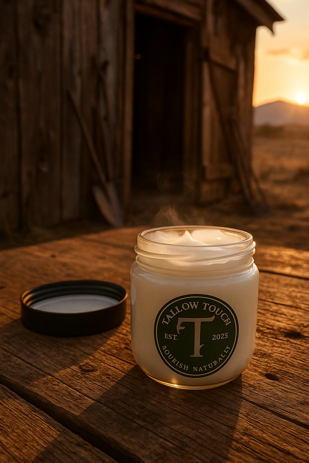 Our beef tallow is a natural, vitamin-rich skincare ingredient that supports skin regeneration and health. Its fatty acids closely resemble human sebum, allowing for easy absorption and long-lasting moisture without clogging pores. With anti-inflammatory benefits and a clean, non-toxic profile, it’s perfect for simple, effective skincare—so you can nourish naturally.